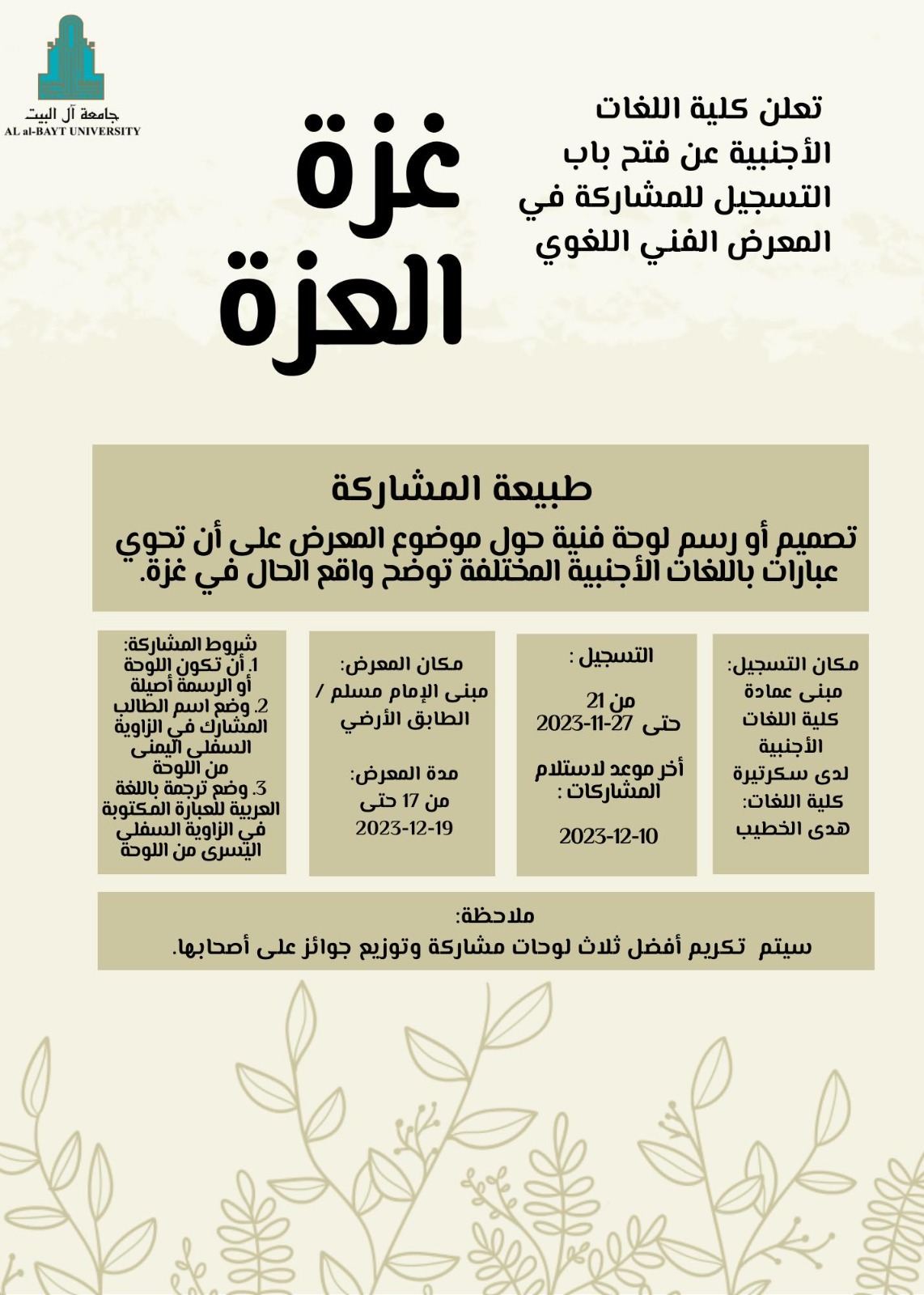 تعلن كلية اللغات الأجنبية عن فتح باب التسجيل للمشاركة في المعرض الفني اللغوي "غزة العزة" أمام طلبة الكلية حسب التفاصيل التالية: